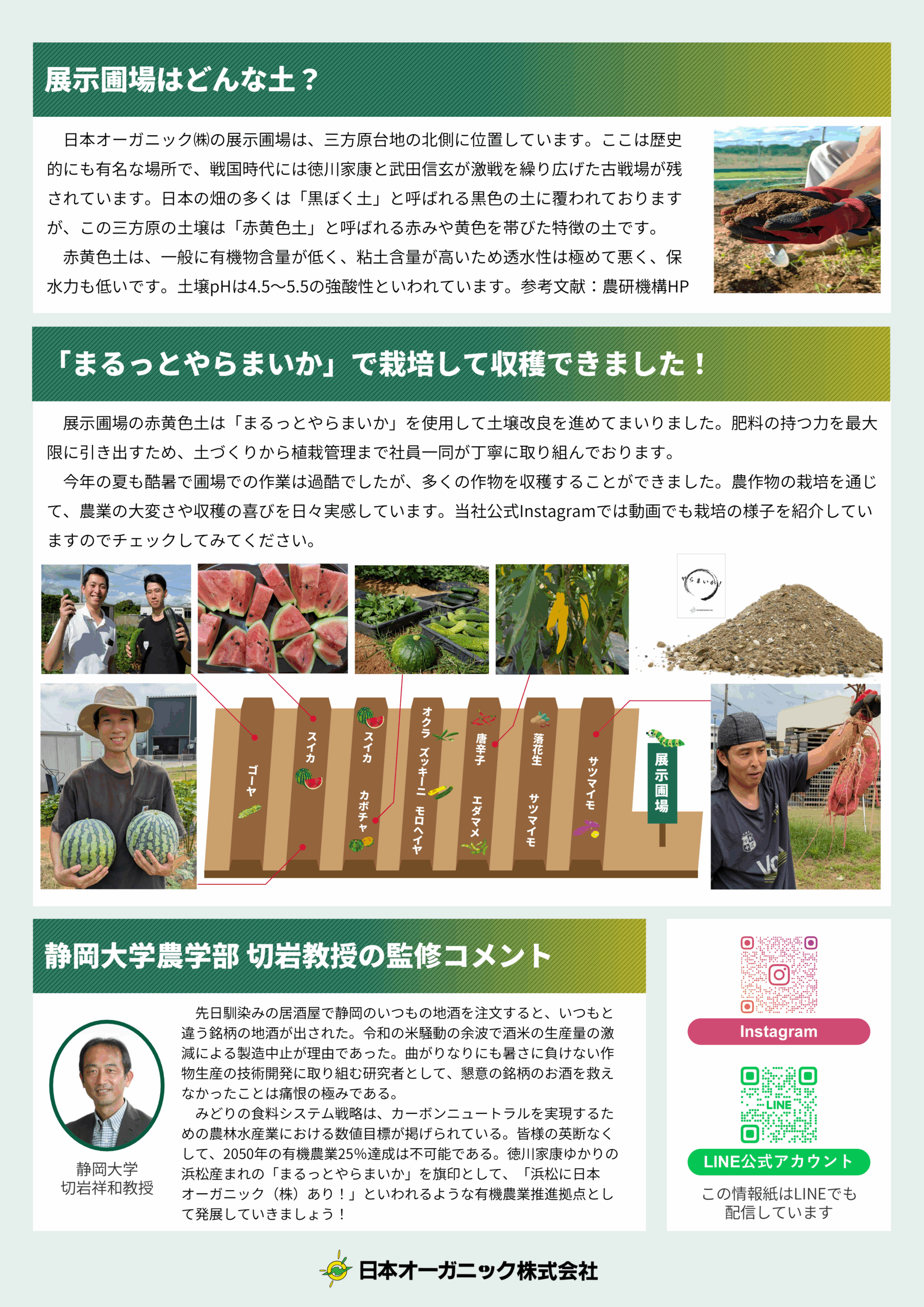 農業や肥料に関する楽しい情報が満載の「つれづれオーガニック通信」の11月号を発行しました。 今回は、社長就任1周年のご挨拶のほか、当社の展示圃場について紹介しています。 また、この情報紙は公式LINEアカウントでも配信しています。ご興味のある方はぜひ友だち登録をしてみてください。