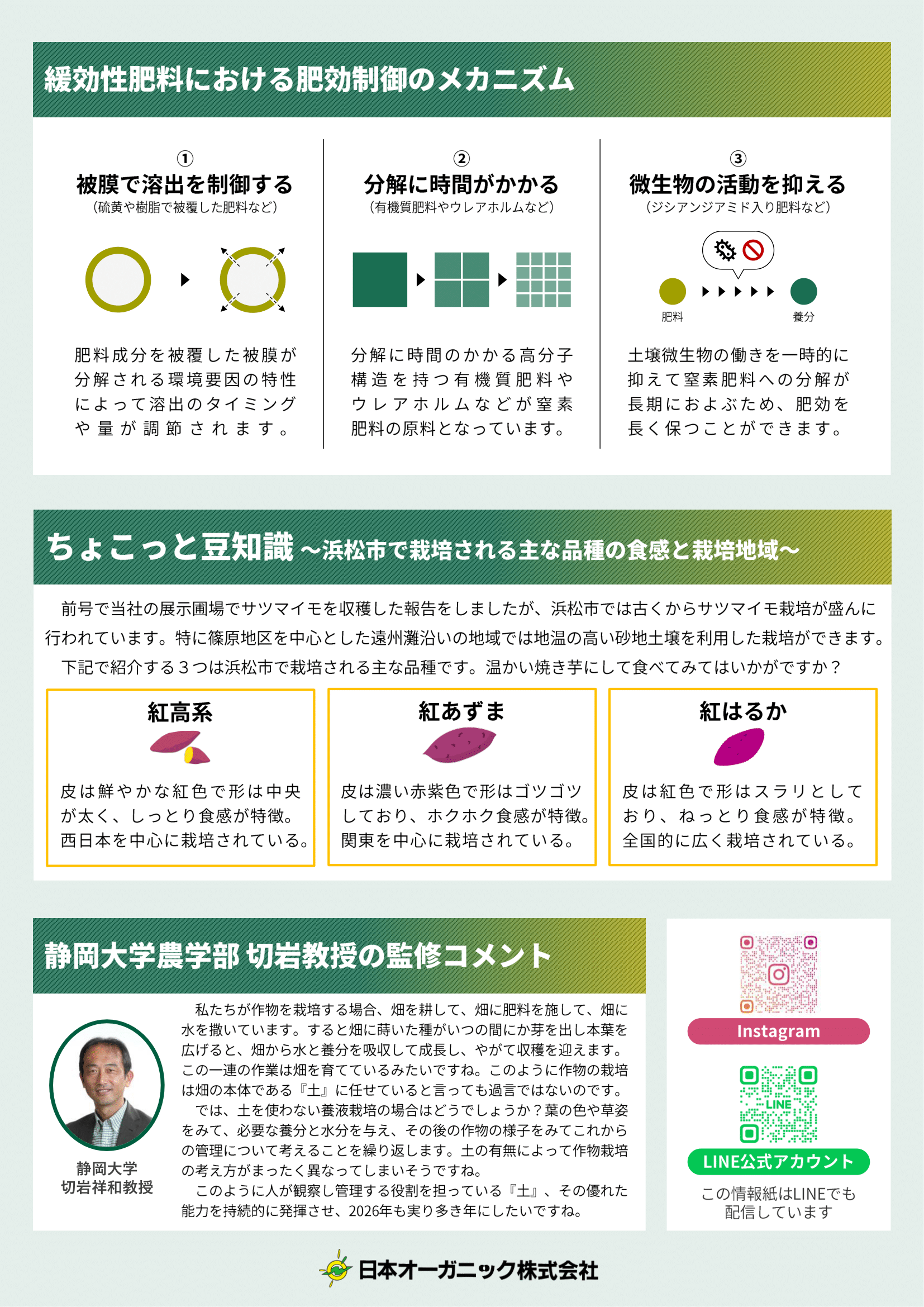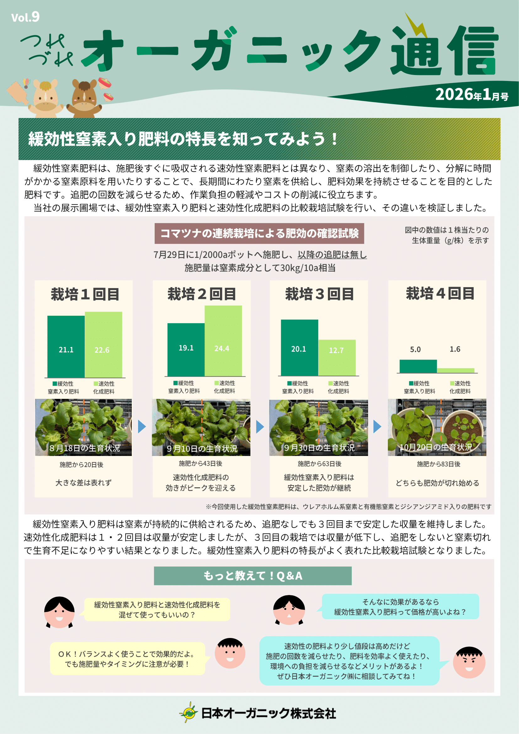 農業や肥料に関する楽しい情報が満載の「つれづれオーガニック通信」の1月号を発行しました。 今回は、緩効性窒素入り肥料の特長について紹介しています。 また、この情報紙は公式LINEアカウントでも配信しています。ご興味のある方はぜひ友だち登録をしてみてください。