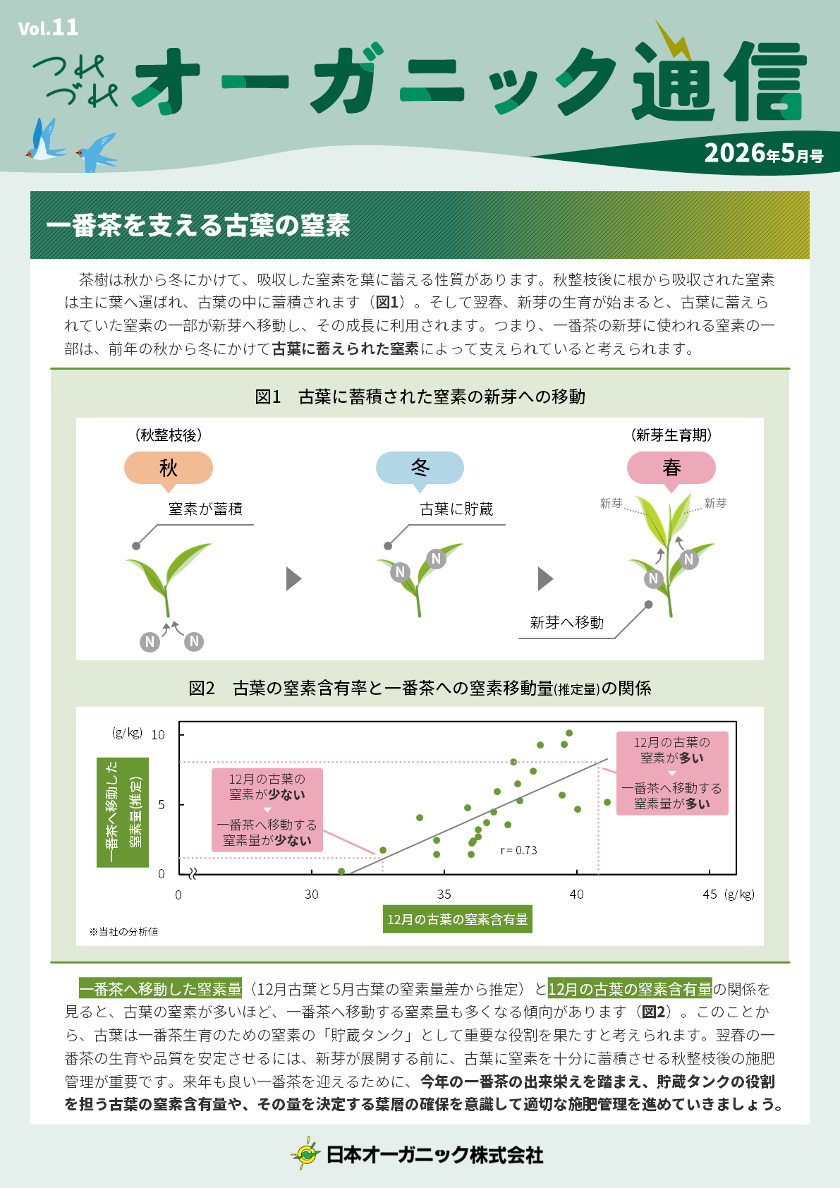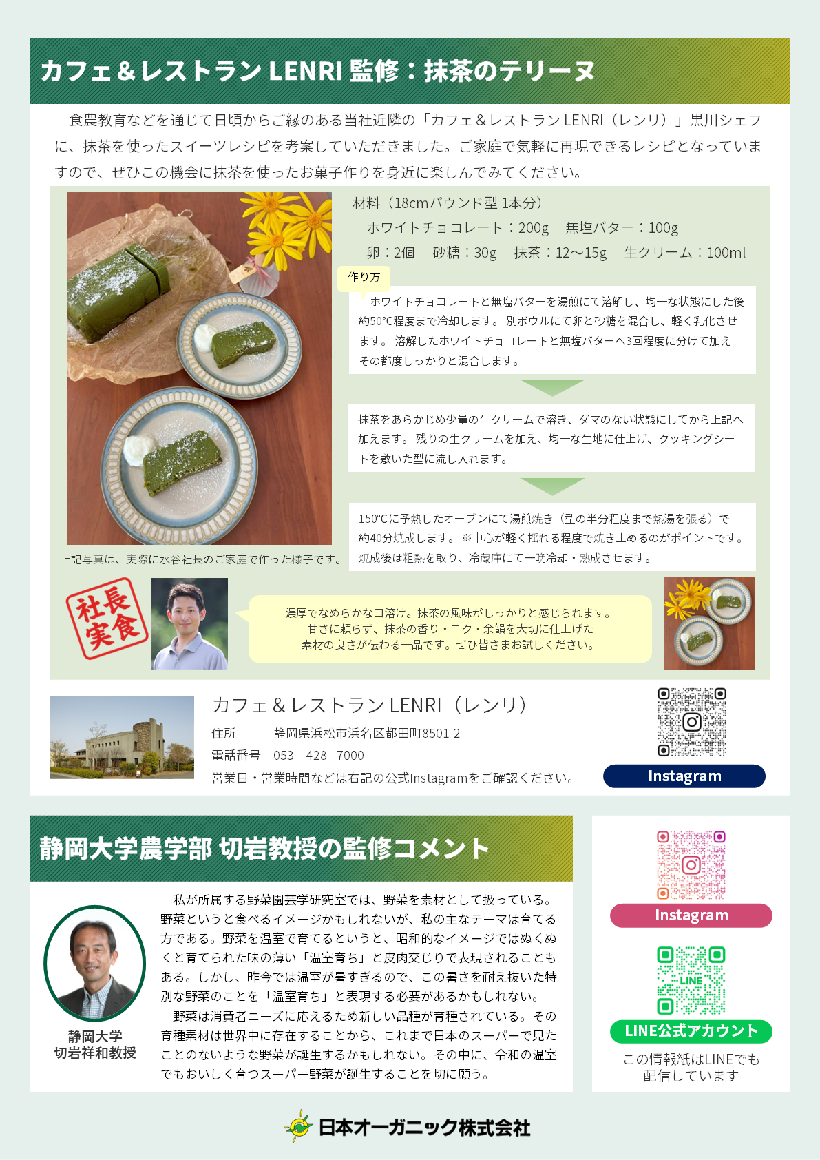農業や肥料に関する楽しい情報が満載の「つれづれオーガニック通信」の5月号を発行しました。 今回は、一番茶を支える古葉の窒素と、カフェ&レストラン LENRI 監修:抹茶のテリーヌを紹介しています。 また、この情報紙は公式LINEアカウントでも配信しています。ご興味のある方はぜひ友だち登録をしてみてください。